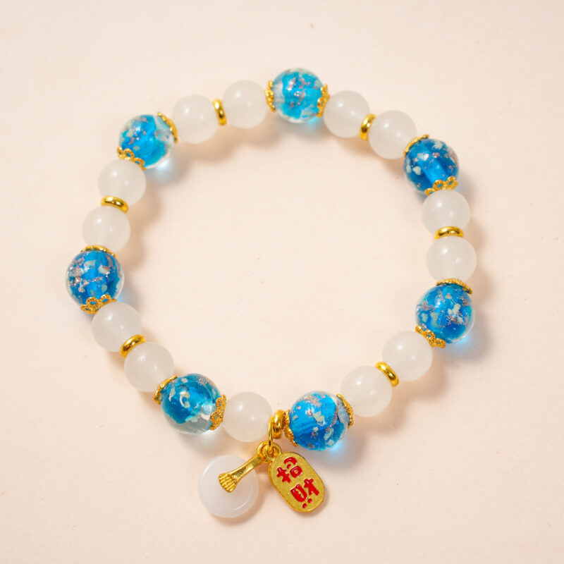 Each bead is created through a meticulous gold-filament glass fusion process, echoing the temple’s sacred craftsmanship.
